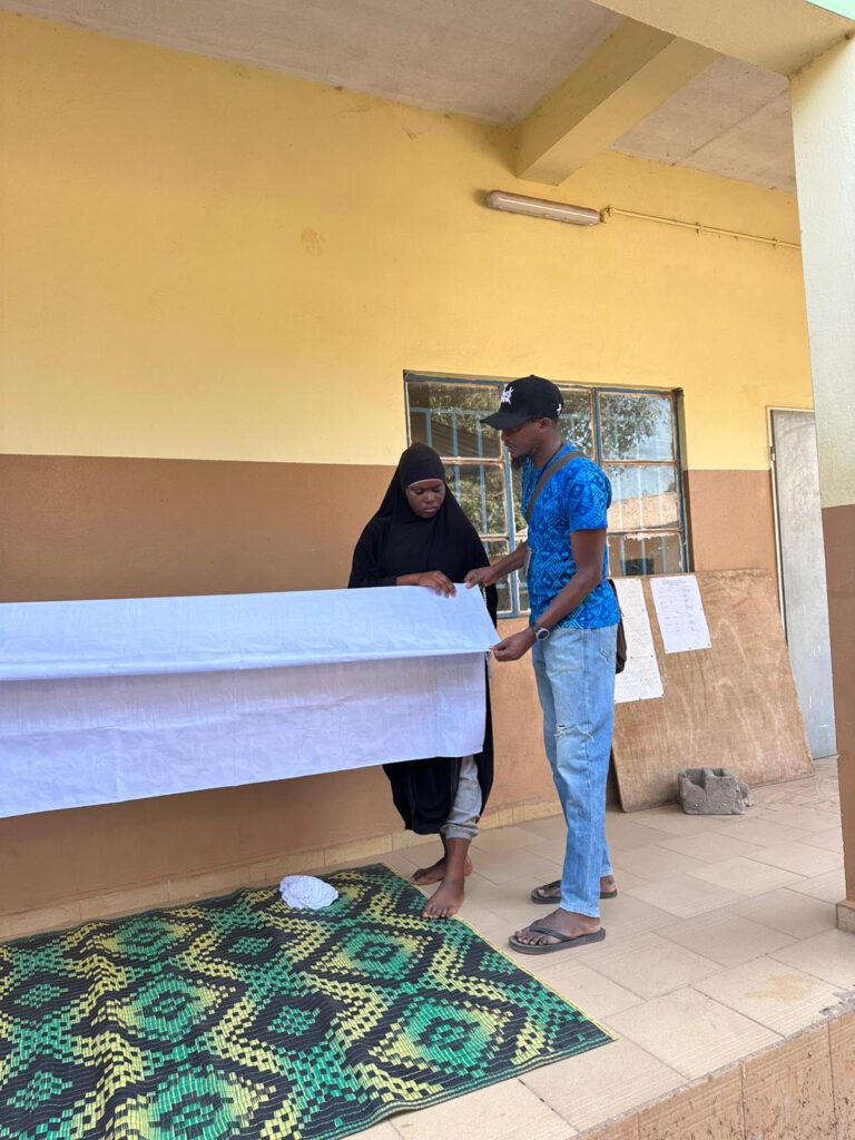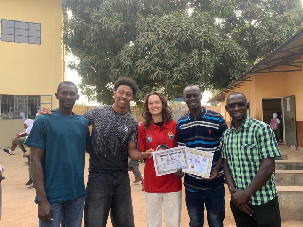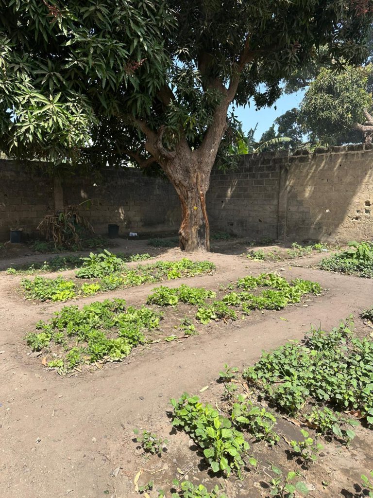 Im Schulgarten unseres Projekts in Gambia wächst und gedeiht es – unter dem Schatten eines großen Mangobaums sprießen Salat, Kräuter und Gemüsepflanzen in den sorgfältig angelegten Beeten. Ein schöner Anblick, der zeigt, was mit Engagement und Pflege möglich ist.